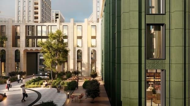 Величественные фасады из натурального травертина с латунными кассетами создают игру света и тени. Орнаментальное панно и декоративная арка символизируют связь классики с природой.