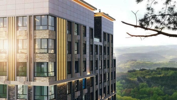 Архитектура органично вписана в ландшафт, фасад представлен в благородных оттенках — беж, терракот, дикий камень, золотые ламели подчёркивают особый статус жилья